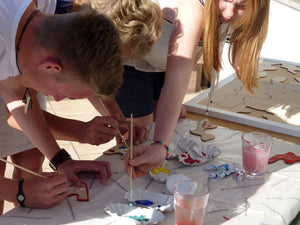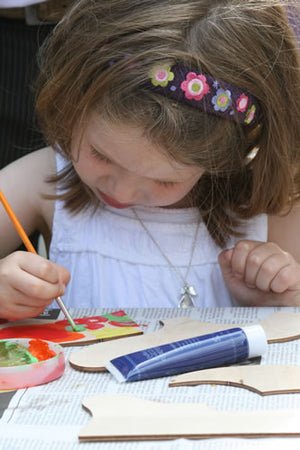 Vorgefertigtes Holzmosaik mit Rahmen, bunte Acryl-Farben, Pinsel, Schälchen oder Pappteller zum Mischen der Farben, Tischdecke oder anderweitige Abdeckung zum Schutz des Tisches.