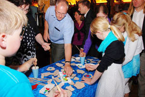 Wenn Sie im Vorfeld das benötigte Material besorgt haben, sind kaum noch weitere Vorbereitungen nötig. Richten Sie eine Malecke in einem, etwas von der Feierräumlichkeit abgetrennten Bereich ein. Schützen Sie den Tisch, auf dem die Materialien bereit gehalten werden, mit einem Tuch oder einer anderweitigen Abdeckung. Bunte Acryl-Farben und Pinsel, sowie Schälchen oder Pappteller zum Mischen der Farben werden auf dem Tisch aufgebaut. Vergessen Sie auch nicht, Reinigungstücher für die Hände bereitzulegen.
