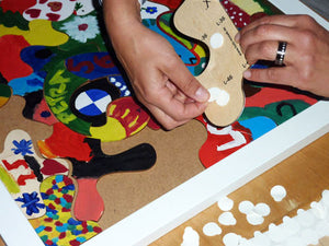 Die Hochzeitsgäste bemalen und gestalten die einzelnen Holzmosaik - Teile kreativ & individuell. Die Mosaikteile werden anschließend zusammengesetzt und das fertige Kunstwerk überreicht.