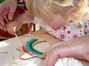 Um das Holzmosaik zu spielen, bereiten Sie etwas abseits einen Tisch vor, auf dem Sie alles vorbereiten. Sie sollten den Tisch abdecken, um ihn vor Farbe zu schützen und Farbe, Pinsel, Wasserbecher und Tücher zum anschließenden Saubermachen der Hände bereitstellen. Ein Vorteil dieser Malecke ist auch, dass Leute, die sich nicht kennen, schnell ins Gespräch kommen, was zu einer lockeren Atmosphäre der Hochzeitsfeier führt.